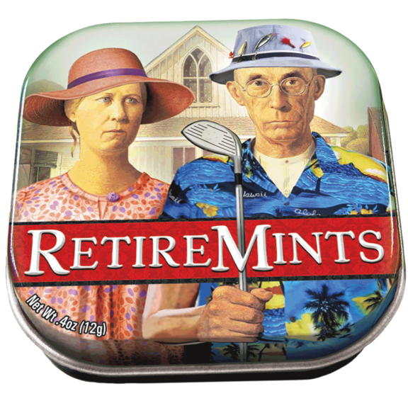 Goodbye tension, hello pension! These new-fangled super-strong mints will put that needed pep in every retiree's step. Modern update of American Gothic by Grant Wood. Peppermint flavor